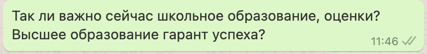 | Говорили о том, что одно из условий успешного будущего вашего ребенка - развитие его в правильной среде. А также осознание ребенком своей ответственности и взрослая позиция, что нужно действовать именно сейчас. С чем у многих современных подростков есть определенные проблемы... А это именно психологическая готовность.